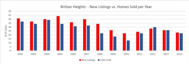 Brittan Heights has also been experiencing the same phenomena. About 10 years ago it was typical to have 35 to 40 condos put on the market each year for sale. For the past few years the numbers have been more in the mid-20s. This is a significant decline in the percentage of available inventory at Brittan Heights – inline with the 35% decline seen in San Mateo County. Whereas before you typically had more homes put on the market each year than were sold, today almost every single property that is put up for sale is sold relatively quickly.