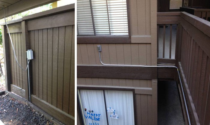 Basically they just ran metal conduit outside the building to the carport. They put the electronics in the locker above the carport and have the charger cable coming out there. The homeowner did need to purchase a liability insurance policy in excess of $1M. This was HOA approved.