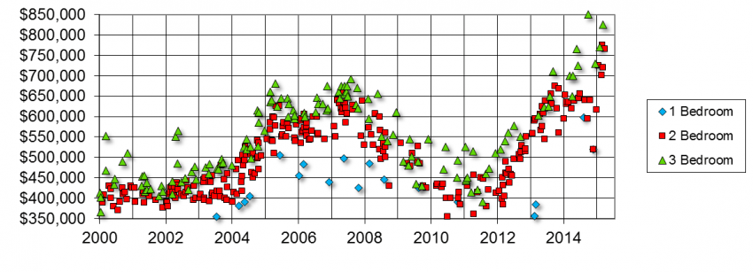Then in late January 2015 everything just busted loose. Now 2/2 units are selling in the $750,000 range while the the 3/2 units are in the low to mid $800,000s.