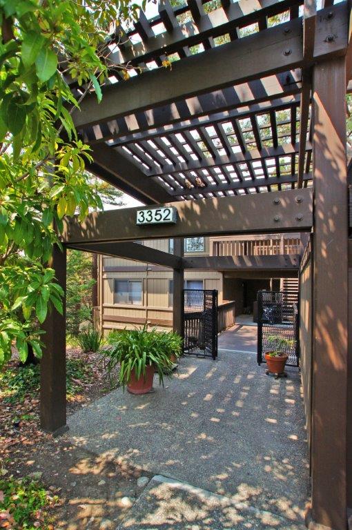 This exceptionally rare top level, corner 3/2 home at Brittan Heights was recently remodeled and has all the best features a homeowner could desire. Enjoy its high-vaulted ceilings and the grand views of the lush green canyon and foothills from the privacy of the living room , dining area and patio.  The kitchen opens up to the living and dining room, it has wood cabinets, stone counter tops and newer appliances. The living room has an impressive gas fireplace & recessed lighting.  There are double pane windows and sliding glass doors throughout, wood floors in the living spaces, all new interior doors, elegant plumbing fixtures, and a new furnace. All bedrooms also have vaulted ceilings, Plantation shutters and ceiling fans.  The master bath has a unique open concept with dual vanities, tile floor, recessed lights and a large stone shower enclosure with tall frameless glass doors. The hall bath has marble floors, a marble tub/shower enclosure and extra tall sliding glass doors.  The carport is located right next to the building entry, there are multiple nature parks nearby, it’s just minutes from the freeway, and to either downtown San Carlos or Redwood City.