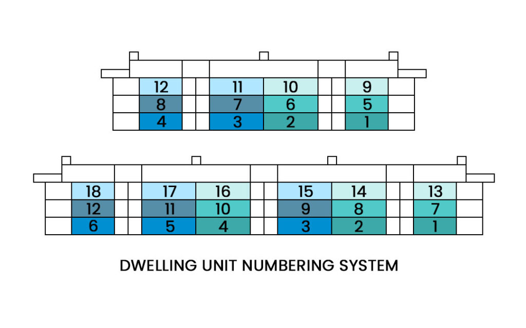 Each building has a total of 12 or 18 units divided into 3 levels. The drawings show the numbering configuration of each building.